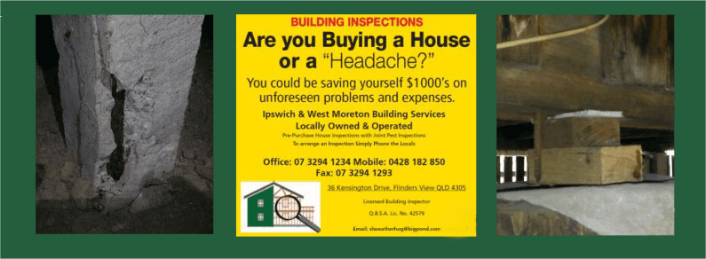 Pre- purchase building inspections are carried out by many different service providers. However, the service provided in an Ipswich & West Moreton Building Services inspection is not only a comprehensive building inspection of the property but also inspects other aspects of the property within the Australian Standards AS4349. 1-2007. It is important that your inspector provides a Building Inspection agreement prior to inspecting the property for you. This lets you know the scope of the inspection and the report and the limitations of a pre purchase building inspection. Ipswich & West Moreton Building Services work in conjunction with local Licensed Pest inspectors. We can organise the Pest inspection to be carried out at the same time we do the Building inspection. If you have a pest inspector that you currently use we are happy to organise to work with them together at the inspection. All it takes is one call to Lisa in the office on 07 32941234 and she will arrange the Building & Pest inspections to be carried out within your time frame. Lisa will also contact the real estate agent to gain access to the property to carry out the inspections.